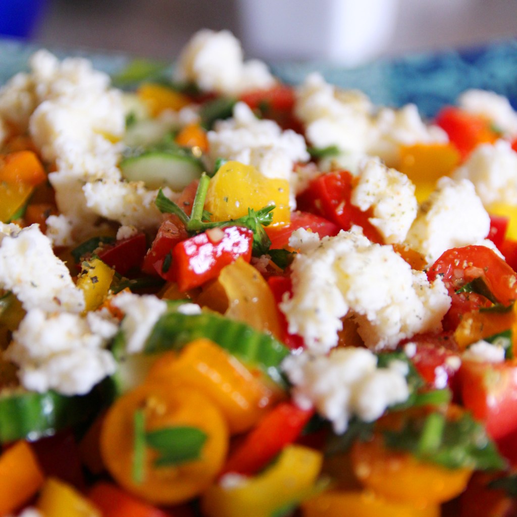 English cucumbers, ripe cherry tomatoes, sweet tricolor bell peppers and fresh feta, this salad was creamy, crunchy and just what we needed for a warm summer lunch.