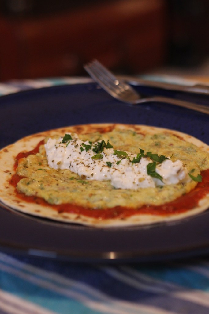 The creamy richness of the cottage cheese mixed with the tang from the pasta sauce works really well with the tortilla and the egg.