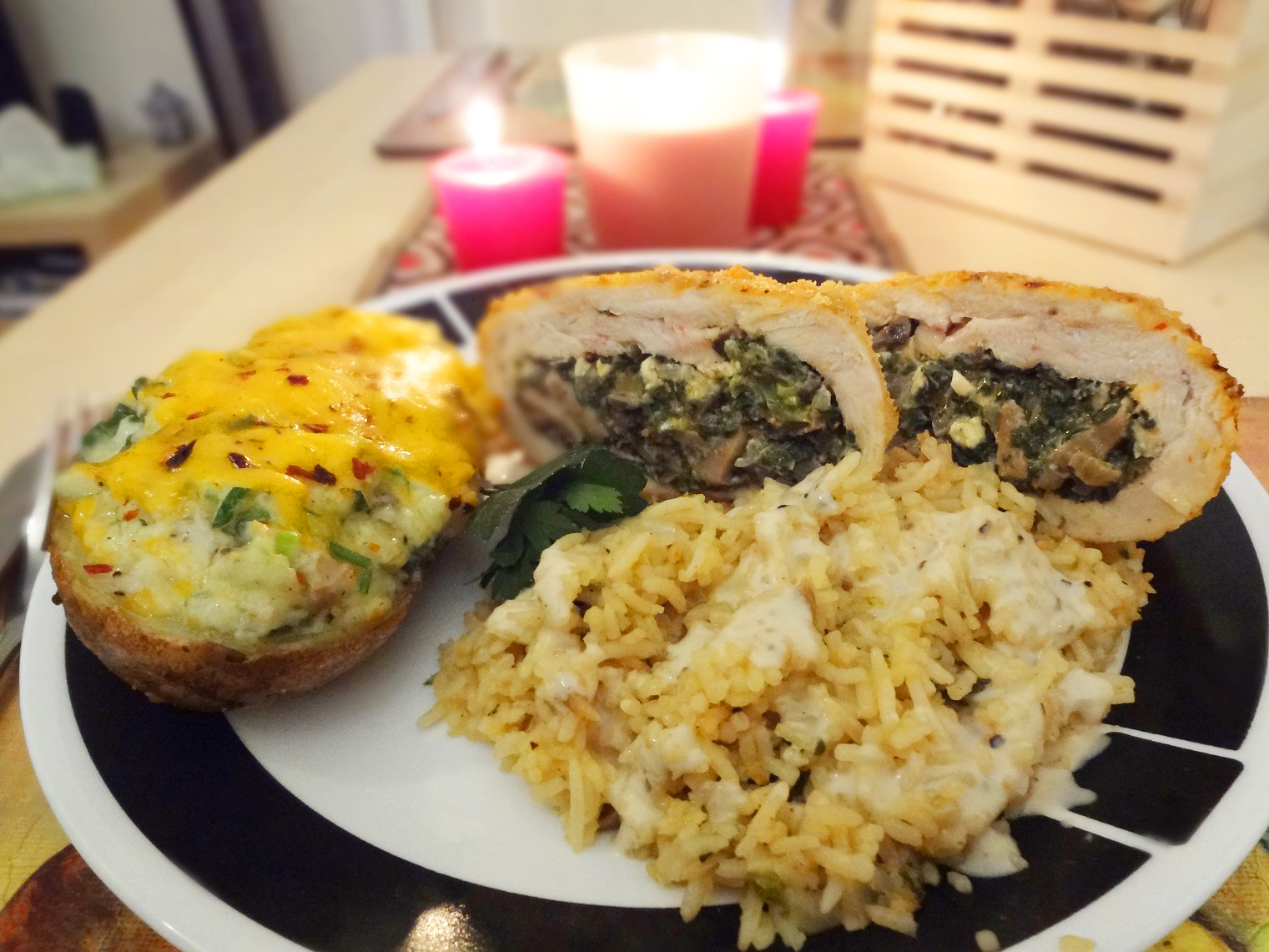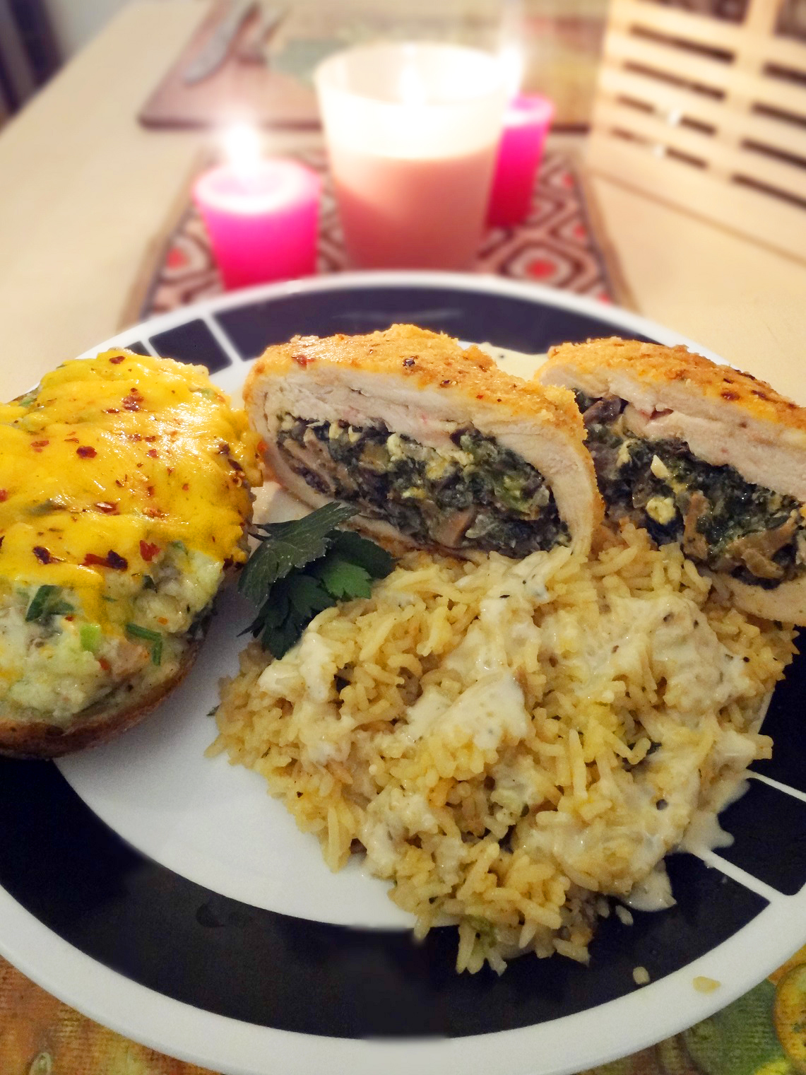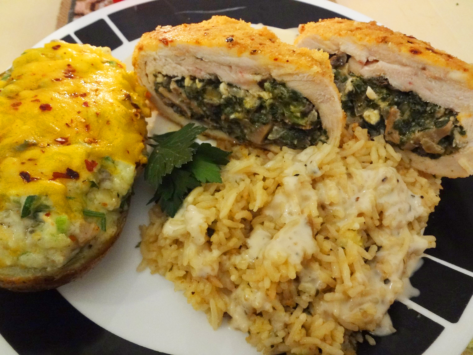 Stuffed Chicken Breast with Twice Baked Potato and Peppery Rice drizzled with Garlic Cream