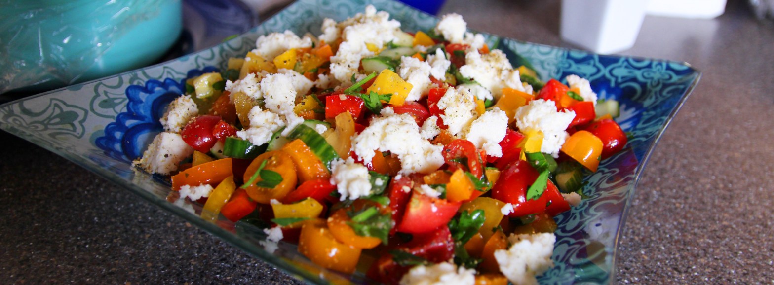 Cut the cucumber and peppers into 1.5-inch cubes and add to a large salad bowl. Halve the cherry tomatoes and add chopped scallions and parsley. Pour over half the dressing and toss. When ready to serve, add the remaining dressing and half the remaining feta and toss again. Garnish with the other half of the remaining feta and serve. This salad serves four as a side and two as a lunch or dinner course.